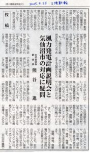立沢自治会副会長 熊谷進氏の投稿が、三陸新報に掲載されました。ご本人の許諾を得て当会HPにも掲載します。「住民理解の醸成」をうたっている事業者の、うらはらな姿勢が問われると思います。