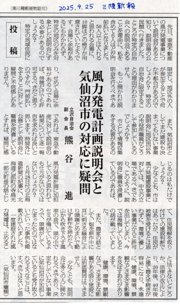 立沢自治会副会長の投稿掲載 2025年9月25日 最終更新日時 : 2025年9月25日 matsumoto 立沢自治会副会長 熊谷進氏の投稿が、三陸新報に掲載されました。ご本人の許諾を得て当会HPにも掲載します。「住民理解の醸成」をうたっている事業者の、うらはらな姿勢が問われると思います。