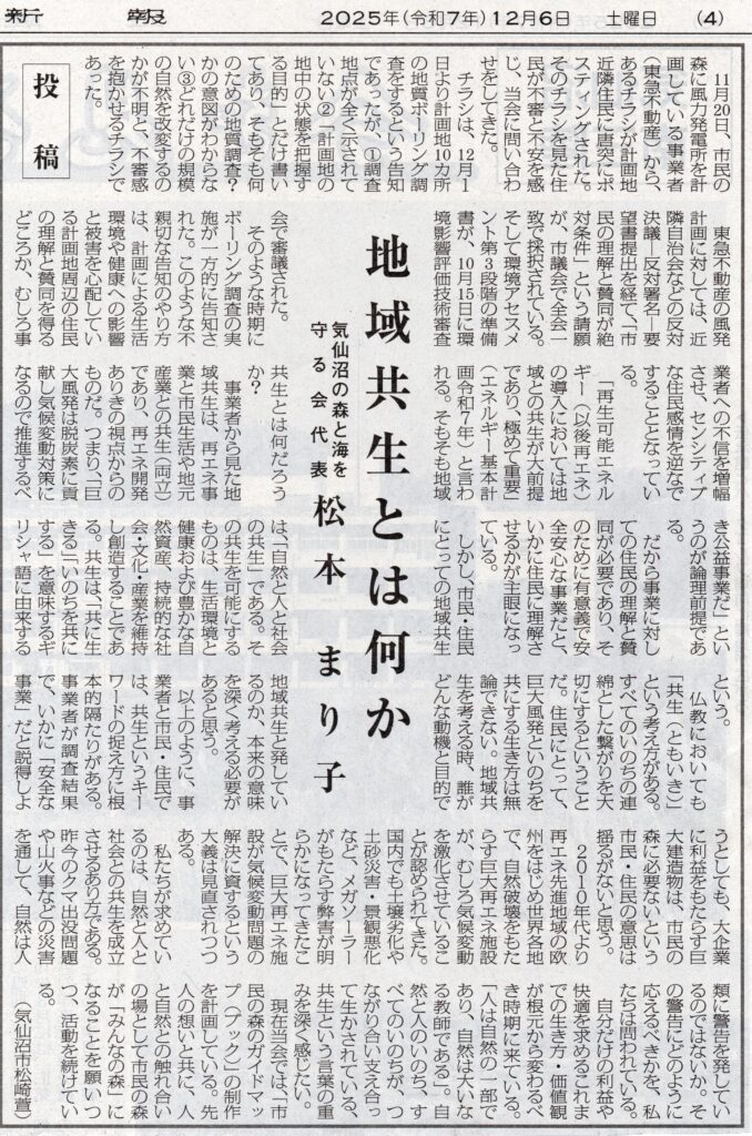 2025年12月6日(土)三陸新報に当会代表の投稿が掲載されました。