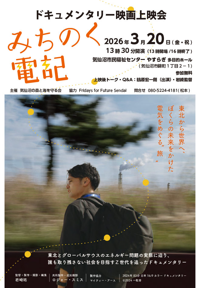 気候変動問題と社会問題を結びつけ真摯に取り組み、持続可能な地球と社会を見すえる鴫原さんたち(Fridays For Future Sendai)の活動に、気仙沼の森と海を守る会は共感と連帯を示し、この上映会を企画しました。