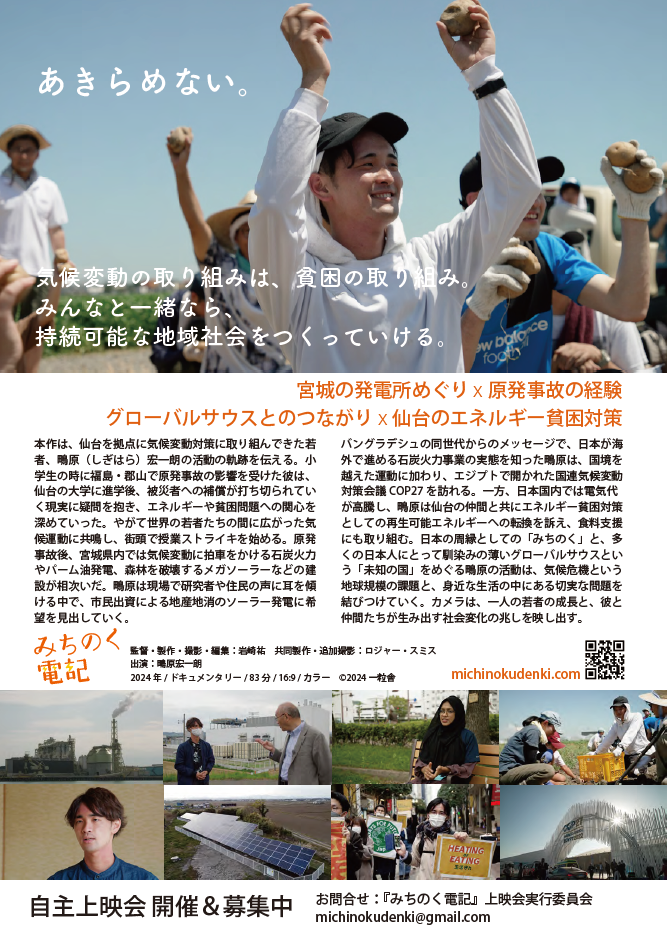 本作は、仙台を拠点に気候変動対策に取り組んできた若者、鴫原(しぎはら)宏一朗さんの活動の軌跡を伝えます。日本の周縁としての「みちのく」と、多くの日本人にとっての「未知の国」をめぐる彼らの活動は、気候危機という地球規模の課題と、身近な生活の中にある切実な問題を結びつけていきます。